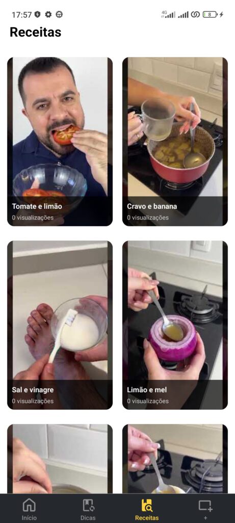 Esta app criada por nós (Percestron), conta com receitas da saúde em forma de texto, vídeo e audio. As mesmas estão mais voltadas em resolver problemas reais como ilustram os títulos a baixo: