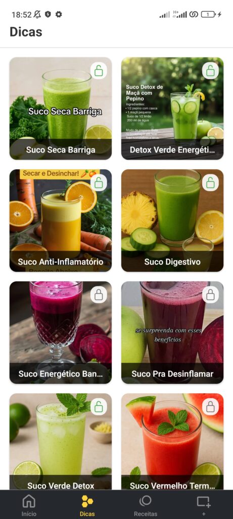 Além das receitas já mencionadas, o aplicativo também contém dicas rápidas de como preparar sucos usando frutas caseiras, junto com o benefício que eles trazem para a saúde.